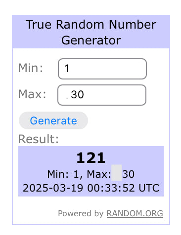 - Winners will be randomly selected using the first number generated on random.org.