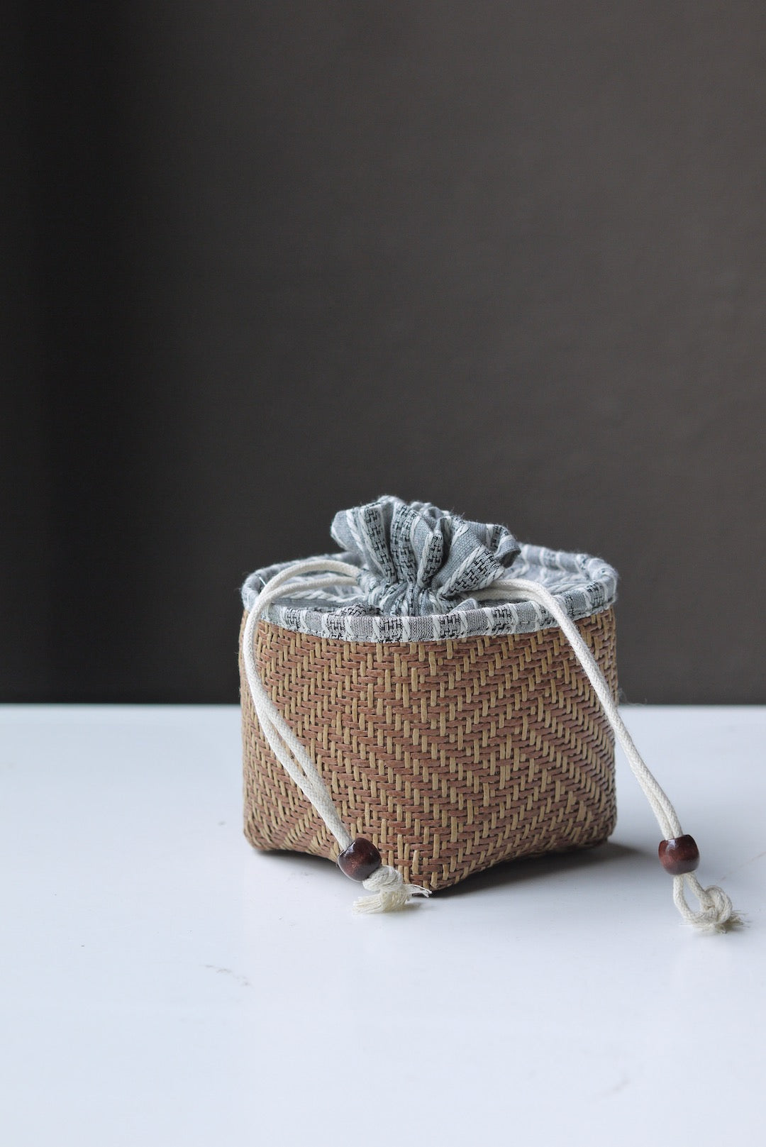 Discover this elegant woven rattan tea pot storage bag, thoughtfully crafted to keep your tea essentials safe and organized. The natural, breathable material ensures your tea pot remains fresh and ready for use. The bag features a charming fabric drawstring closure, accented with wooden beads, adding a touch of traditional craftsmanship to its design.
